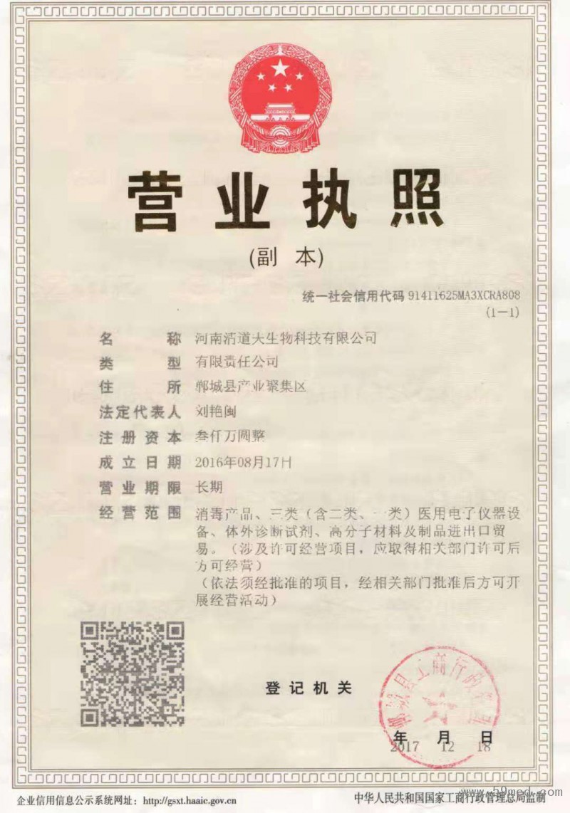 | 發(fā)證機(jī)構(gòu): | ??鄲城縣工商行政管理局 | 發(fā)證時(shí)間 : | ??2017-12-18 |