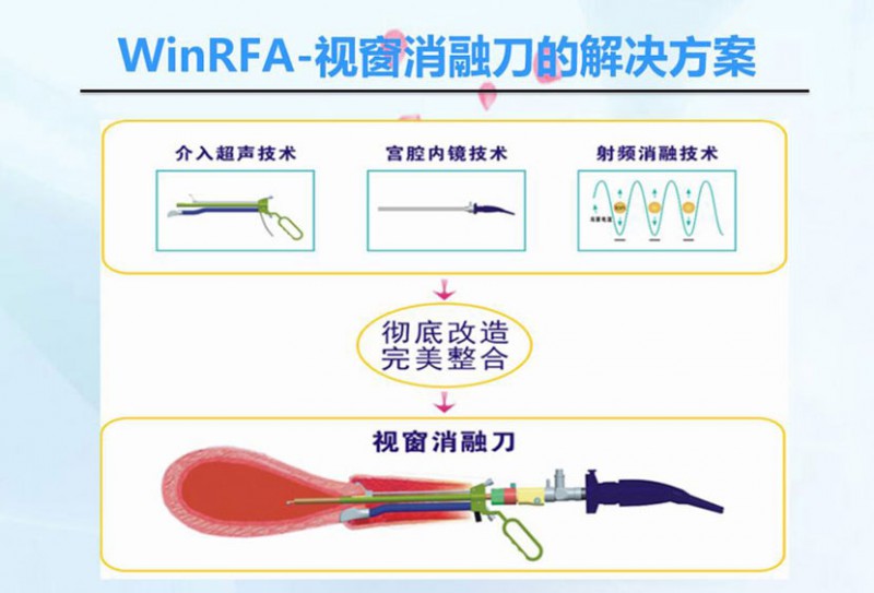 WinRFA•視窗消融刀是在雙重可視的監(jiān)控下,通過具有剪切、止血、凝固、剔除四大功能的消融刀具經(jīng)陰道、宮頸等自然腔道,將射頻電磁波準(zhǔn)確地介入到病變部位上,射頻電磁波激發(fā)病變組織的細(xì)胞進(jìn)行等離子振蕩,離子相互摩擦產(chǎn)生生物高熱效應(yīng),溫度達(dá)到80-100度,從而有效的消融病變組織并凝固血管,射頻治療系統(tǒng)能智能控制病變組織的變性程度和范圍,最后使病變組織變性、壞死和排出體外,達(dá)到治療子宮出血(DUB)、子宮切口(瘢痕)妊娠、腺肌瘤(?。┑燃膊〉哪康?。